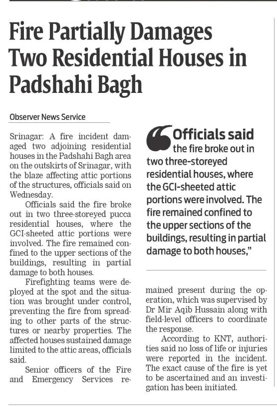 Fire Partially Damages Two Residential Houses in Padshahi Bagh