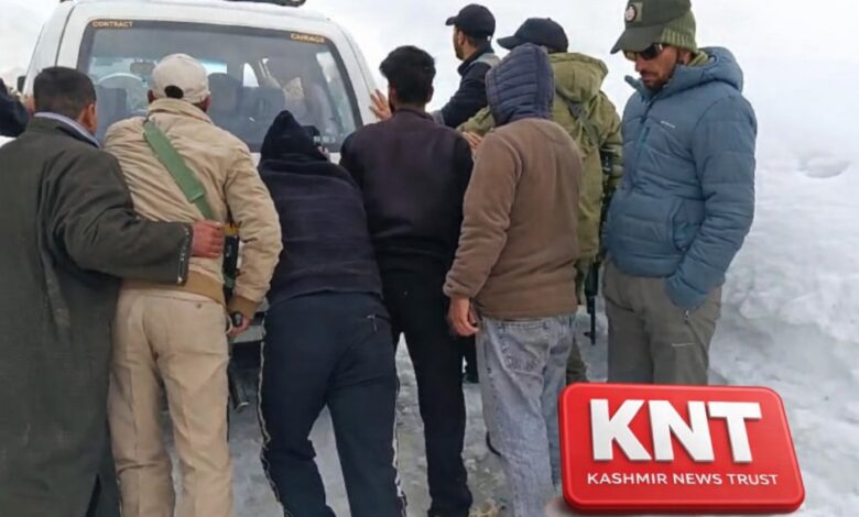 Bandipora, April 18, KNT: Bandipora Police, in coordination with the Border Roads Organization (BRO), rescued around 30 stranded vehicles at Razdhan Pass on the Gurez–Bandipora road after fresh snowfall made the route slippery and unsafe.