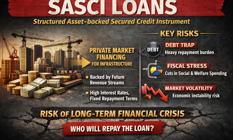 SASCI, or Structured Asset-backed Secured Credit Instrument, is a market-linked borrowing mechanism typically used for large infrastructure financing. Unlike conventional public borrowing, SASCI loans are raised from private financial markets and are backed by future revenue streams or assets, making them commercially structured loans rather than sovereign or welfare-oriented funding.