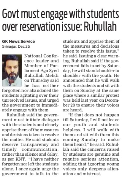 Govt must engage with students over reservation issue: Ruhullah