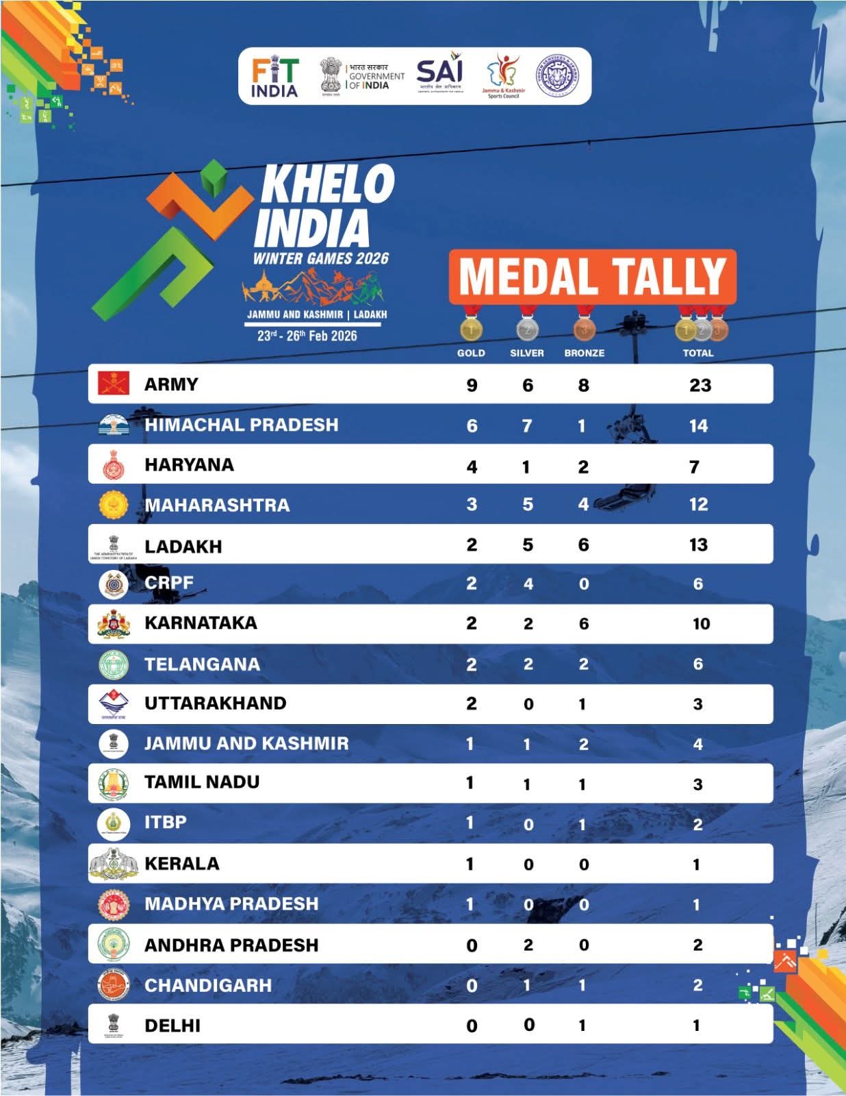 Gulmarg, Feb 26, KNT: Despite being the host and possessing one of the country’s most snow-rich terrains, Jammu and Kashmir delivered a disappointing performance at the Khelo India Winter Games 2026, finishing well below expectations and trailing even Ladakh in the overall medal standings.