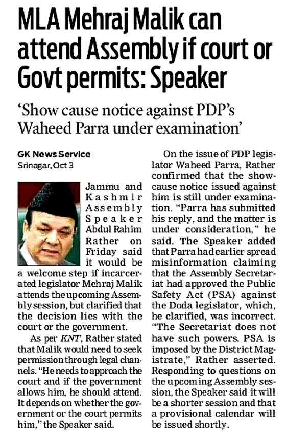 MLA Mehraj Malik can attend Assembly if court or Govt permits: Speaker
