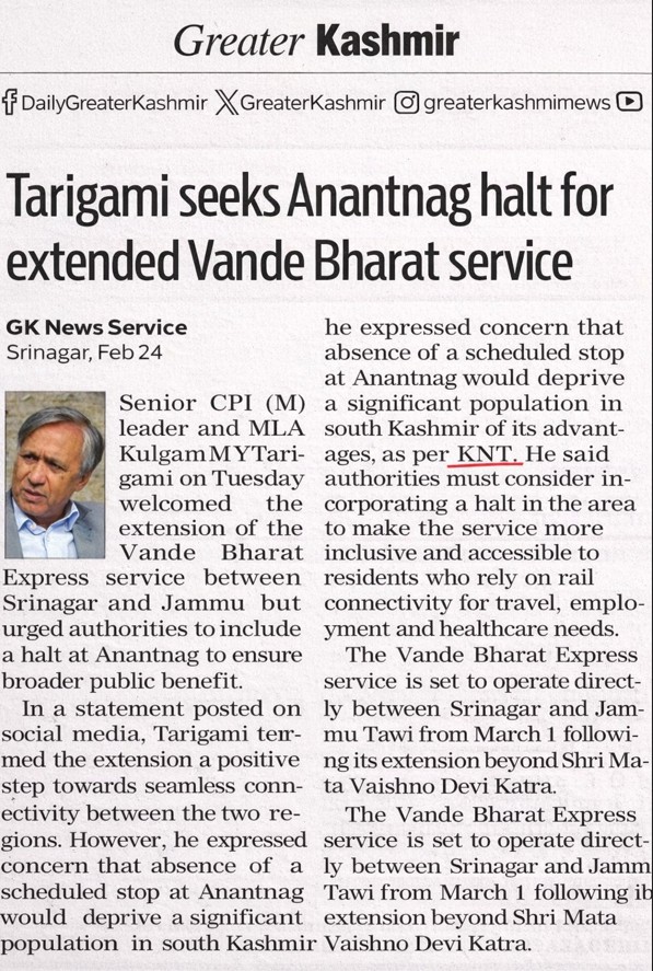 Tarigami Seeks Anantnag Halt for Extended Vande Bharat Service